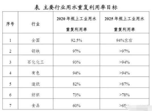 《實施方案》要求以主要用水行業為重點,以試點示范為引領,以先進技術推廣應用為抓手,分類統籌推進工業廢水循環利用,促進工業綠色高質量發展。具體提出,到2025年,力爭規模以上工業用水重復利用率達到94%左右,鋼鐵、石化化工、有色等行業規模以上工業用水重復利用率進一步提升,紡織、造紙、食品等行業規模以上工業用水重復利用率較2020年提升5個百分點以上,工業用市政再生水量大幅提高,萬元工業增加值用水量較2020年下降16%,基本形成主要用水行業廢水高效循環利用新格局。