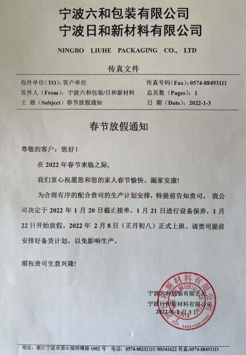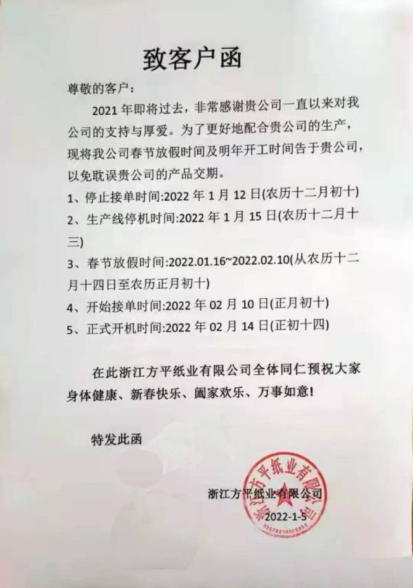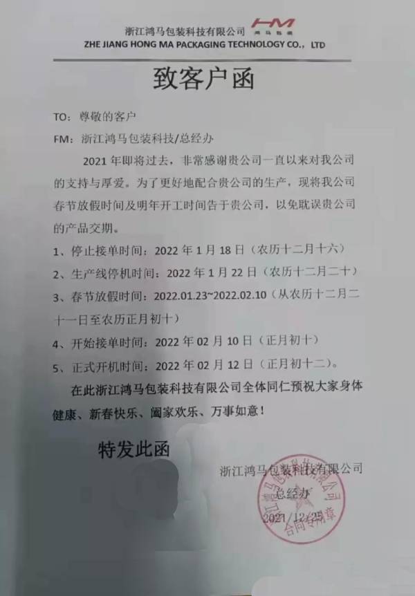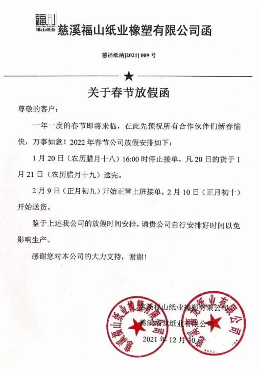 步入2022年后,發布春節放假通知函的包裝企業逐步增多。慈溪福山紙業橡塑有限公司、浙江方平紙業有限公司、寧波六和包裝有限公司/寧波日和新材料有限公司等企業,也明確了停止接單、生產線停機、節前放假及節后上班時間。