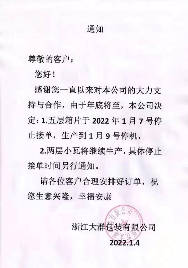 2022年1月4日,一份包裝企業的通知函在業內引起不小議論。該企業宣布,五層箱片于1月7日停止接單,生產到1月9日停機;兩層小瓦將繼續生產,具體停單時間另行通知。如無意外,這或許是業內最早停止生產部分訂單的包裝企業。