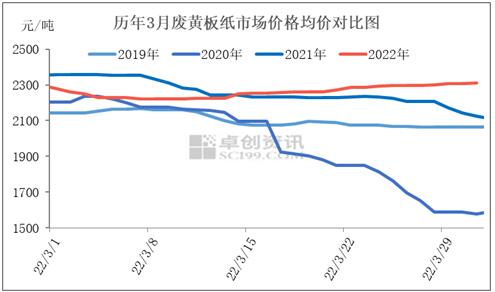 據卓創資訊監測數據顯示,2022年一季度廢黃板紙市場價格先下滑后反彈,其中3月份的廢黃板紙價格連續3周上漲,此與往年趨勢有所差異。
