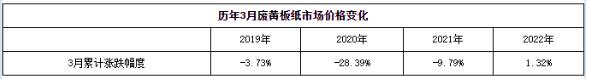 由上表可見,2020年3月、2021年3月廢黃板紙市場價格跌幅較大,此為紙包裝淡季疊加一定外因所致。而2019年3月廢黃板紙價格跌幅較為合理,波動幅度處于正常范圍。