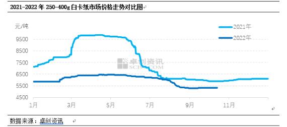 2022年第三季度供需矛盾激化,白卡紙市場下跌調整。四季度供應仍有增加預期,但傳統(tǒng)旺季需求向好,加之成本支撐下紙廠拉漲心態(tài)堅決,預計市場存窄幅上行可能。