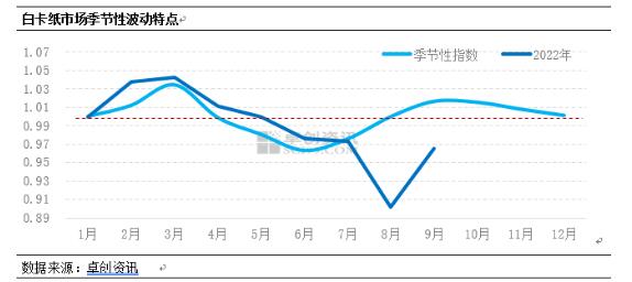 從白卡紙市場季節(jié)性波動特點來看,三季度處于淡季下滑與旺季來臨市場回漲的轉換期。可以從近十年季節(jié)性指數看出,7-8月份市場跌勢逐步收窄,9月份由跌轉漲。但是今年7-8月份市場跌勢逐步擴大,尤其是“金九”市場均價環(huán)比不漲反降,呈現(xiàn)出與歷史規(guī)律相悖的走勢。市場需求疲軟是白卡紙走勢低于預期的主要影響因素。