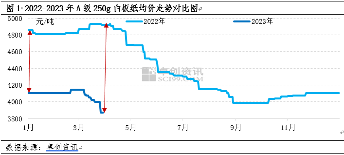 2023年一季度白板紙市場呈現先穩定后階梯式下滑走勢,市場需求恢復不及預期,于3月初提前進入淡季,紙價開始承壓下行。二季度進入市場傳統淡季,或將延續疲軟態勢,淡季更淡趨勢更加顯著。