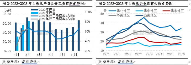 從供應面來看,紙廠開工積極性減弱,但庫存壓力持續增加。由圖2可見2023年一季度白板紙紙廠整體開工水平雖呈現上漲趨勢,但同比去年一季度有所下滑,紙廠開工積極性減弱,個別小廠陸續退出。據卓創資訊數據顯示,一季度白板紙紙廠產量環比下滑9.38%,同比去年一季度下滑16.93%;開工負荷率環比下滑8.45個百分點,較去年同期下滑4.44個百分點。