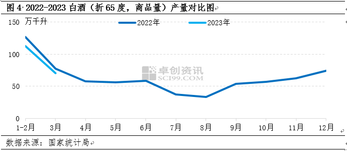 從需求面來看,一季度市場需求整體偏弱,其中白酒行業為白板紙下游重要消費行業,傳統白酒行業定義的旺季是從每年中秋節所在的一個月開始到次年3月結束。但今年來看,1-2月白酒產量下滑較為明顯。圖4可見,據國家統計局數據顯示,2023年1-2月白酒產量112.4萬千升,同比下滑11.22%。因終端需求恢復不及預期,經銷商及印廠整體訂單不足,下游接盤意向較低,因此一季度市場提前進入淡季。
