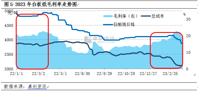 由圖5可見,2023年一季度白板紙毛利率呈現倒V字型走勢。其中,廢黃板紙作為主要的原料之一,廢紙市場價格的延續2022年下半年跌勢,價格一路下行,對白板紙市場支撐無力。2023年1-3月份,國內廢黃板紙價格影響因素則轉向了需求端。隨著國內限制措施全面放開,廢黃板紙供應恢復正常。但需求壓力開始顯現,由于成品紙需求不及預期,紙企為了修復利潤,率先下調廢黃板紙價格。2023年2月中旬以后,紙企為降低成品紙庫存也開啟了成品紙價格下調的格局。由圖5可見,一季度總成本環比去年四季度下滑5.81%,較2022年一季度下滑13.63%,但因白板紙價格走勢先穩定后下行,因此毛利率呈現先上漲后下滑趨勢。據卓創資訊數據顯示,一季度白板紙毛利率環比上漲5.04個百分點,但同比去年同期下降2.10個百分點。因此從行業毛利率來看,紙廠開工積極性較去年有所減弱,市場運行動力不足。
