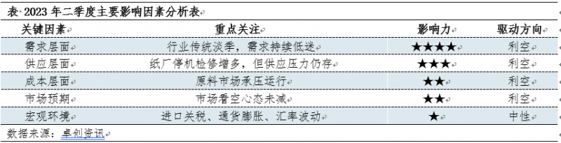 從需求端來看,二季度通常為行業傳統淡季,市場需求持續低迷,經銷商仍無備貨意向,市場成交剛需為主,將利空紙價;從供應端來看,紙廠開工積極性減弱,停機檢修增多,據目前企業公布停機檢修計劃來看,預計二季度檢修損失量約13萬噸左右,但山東地區有一條35萬噸新增產能或將于4月釋放,因此市場供應壓力仍存。因此綜合供需來看,供需矛盾改善空間不大,市場運行乏力。