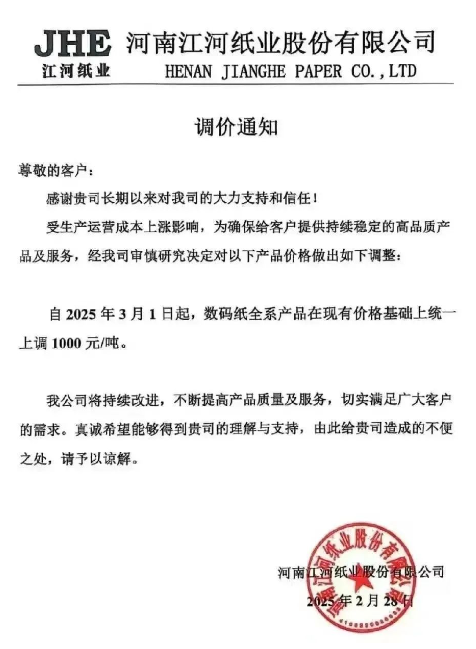河南江河紙業(yè):自2025年3月1日起,數(shù)碼紙全系產(chǎn)品在現(xiàn)有價(jià)格基礎(chǔ)上統(tǒng)一上調(diào) 1000 元/噸。