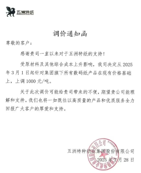 五洲特紙:受原材料及其他綜合成本上升影響,我司決定從2025年3月1日起針對(duì)集團(tuán)旗下所有數(shù)碼紙產(chǎn)品在現(xiàn)有價(jià)格基礎(chǔ)上,上調(diào)1000元/噸。