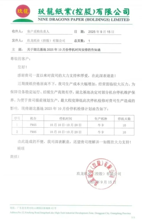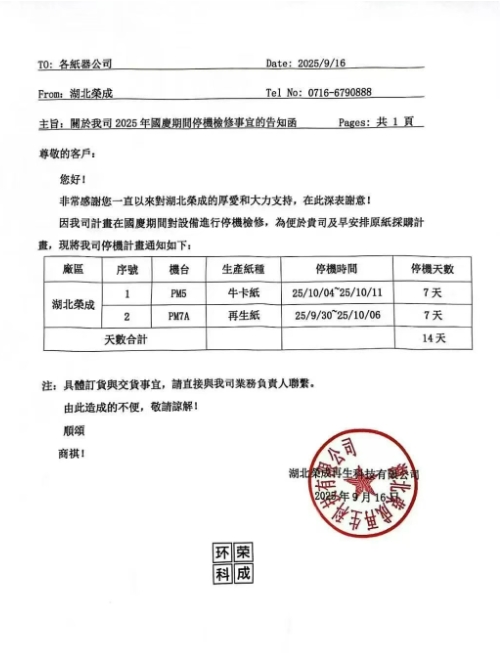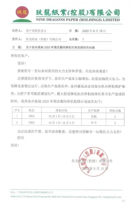 自九月二十二日起,泉州基地所有牛卡、瓦楞紙價格上調RMB30元/噸。
