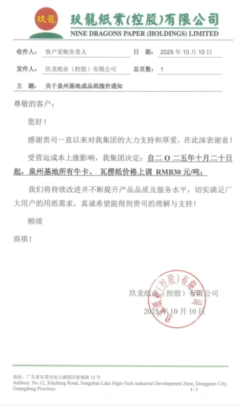 自十月二十日起,泉州基地所有牛卡、瓦楞紙價格上調(diào)RMB30元/噸。