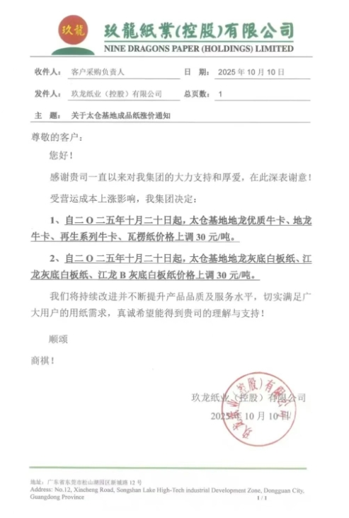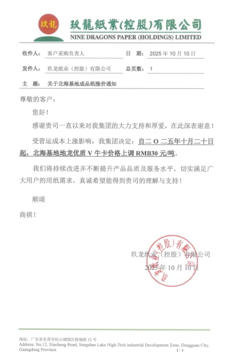 隨著國慶+中秋雙節(jié)長假落下帷幕,10月10日,玖龍?zhí)旖颉⒑颖薄|莞、北海、太倉、泉州及沈陽七大基地齊發(fā)最新調(diào)價通知。