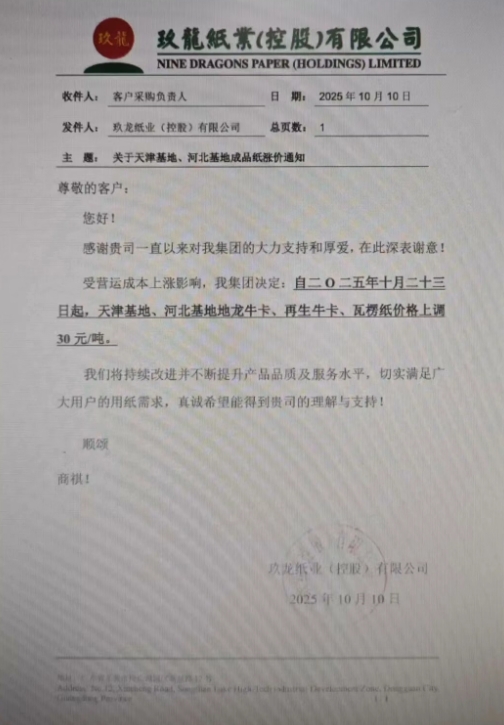 1、自十月二十日起,東莞基地地龍優(yōu)質(zhì)V牛卡、地龍牛卡、地龍再生牛卡、江龍再生牛卡、玖龍瓦楞紙、地龍瓦楞紙價格上調(diào)RMB/HKD30元/噸(USD4元/噸)。