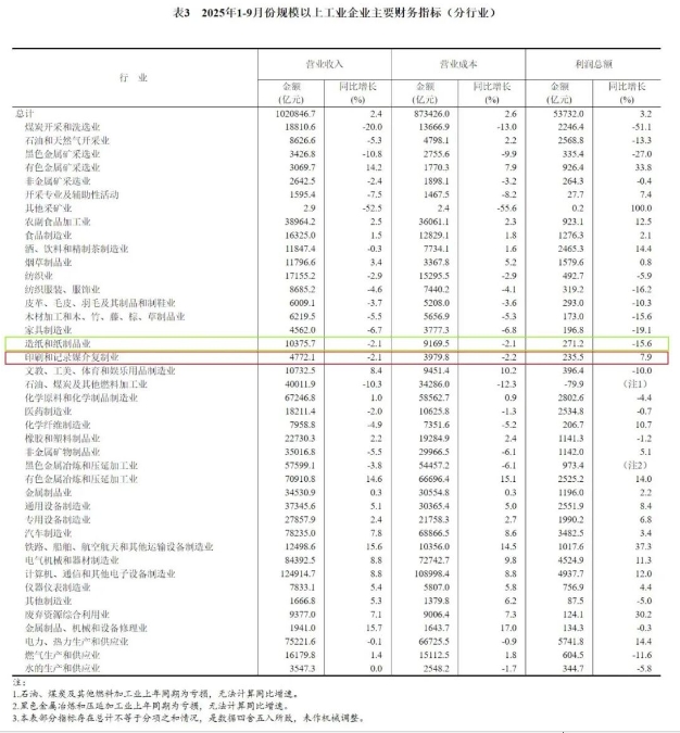 值得關(guān)注的是,造紙和紙制品業(yè)實現(xiàn)利潤總額271.2億元,同比下降15.6%;印刷和記錄媒介復(fù)制業(yè)實現(xiàn)利潤總額235.5億元,同比增長7.9%。