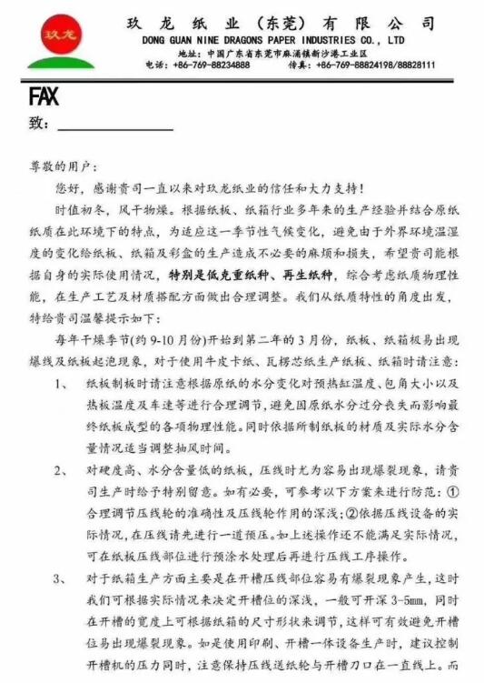 時值初冬,風干物燥。根據紙板、紙箱行業多年來的生產經驗并結合原紙紙質在此環境下的特點,為適應這一季節性氣候變化,避免由于外界環境溫濕度的變化給紙板、紙箱及彩盒的生產造成不必要的麻煩和損失,希望貴司能根據自身的實際使用情況,特別是低克重紙種、再生紙種,綜合考慮紙質物理性能,在生產工藝及材質搭配方面做出合理調整。我們從紙質特性的角度出發,特給貴司溫馨提示如下: