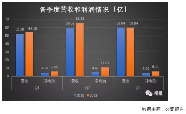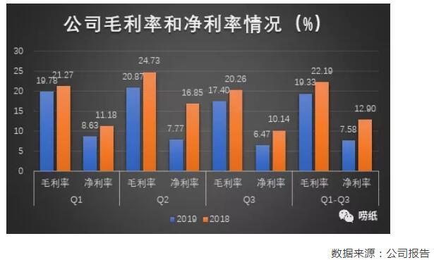 分季度來看,今年前三季度營收逐步增長,和去年同期相比均有不同程度的下降,但下降幅度在逐漸收窄,第三季度營收和去年同期基本持平。今年三個季度凈利潤波動較大,2019Q3凈利潤最低,為3.99億,同比下降34.70%。今年第三季度營收和去年基本持平,而凈利潤卻下降較為嚴重,其主要原因系原材料成本上漲,2019Q3營業成本為49.3億元,較2018Q3的47.3億元增加了2億元。另外,銷售費用和管理費用增加也較為嚴重,分別增加了36.79%/21.01%。
