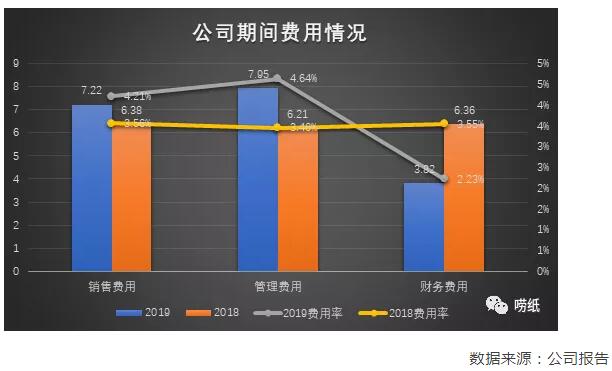 2019年前三季度,山鷹紙業期間費用(研發費用未計)為18.99億元,同比增加0.20%,期間費用率為11.08%,同比增加0.52pct。其中,銷售費用/管理費用/財務費用分別為7.22億/7.95億/3.82億,相應費用率分別為4.21%/4.64%/2.23%,分別同比變動0.65pct/1.18pct/-1.32pct。財務費用的下降主要系本期匯兌損失較上年同期減少及利息收入增加所致,期間財務費用中利息費用為6.67億,和去年的6.63億相比稍有增加,而利息收入為3.03億元,較去年同期增加63.90%。