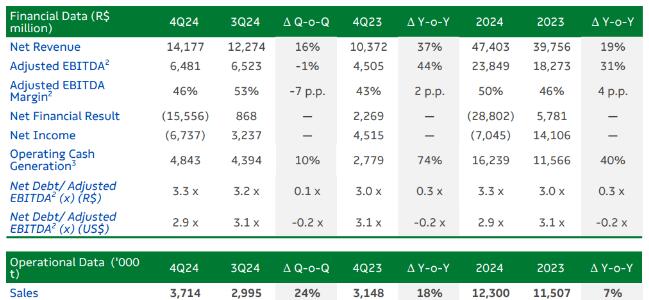 調整后的息稅折舊攤銷前利潤與2024年第三季度相比增長了1%,這主要歸因于以下幾點積極因素:銷量顯著增加(+25%), 這得益于位于里瓦斯杜里奧帕爾多工廠的順利投產;美元兌巴西雷亞爾的平均匯率有所升值。