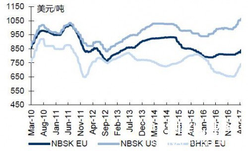 本周國際針葉漿、闊葉漿價格上漲,NBSK EU 報839.88美元/噸,較上周上漲1.95%;BHKP EU報741.06美元/噸,較上周上漲1.63%。本周國際漿市需求改善,行情穩定,針葉漿、闊葉漿價格上漲。