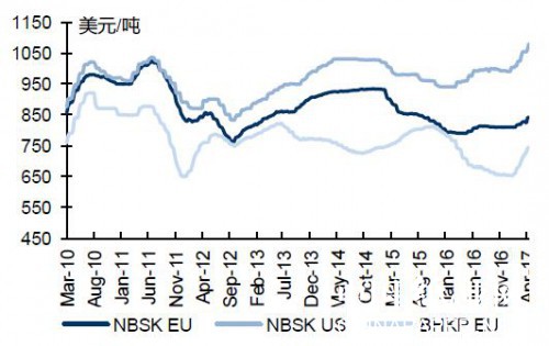 本周國際針葉漿價格穩定、闊葉漿價格上漲,NBSK EU 報839.9美元/噸,基本持平上周;BHKP EU報744.7美元/噸,較上周上漲0.49%。本周國際漿市需求改善,行情上漲,針葉漿、闊葉漿價格上漲。