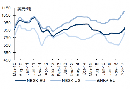 本周國際針葉漿下跌、闊葉漿價格上漲。NBSK EU報888.87美元/噸,較上周下跌0.01%;BHKP EU報826.38美元/噸,較上周上漲0.71%。