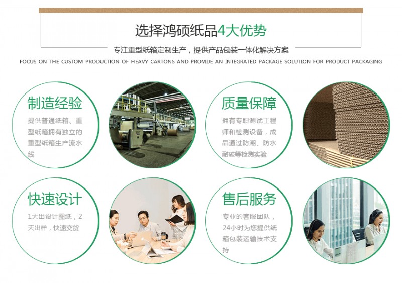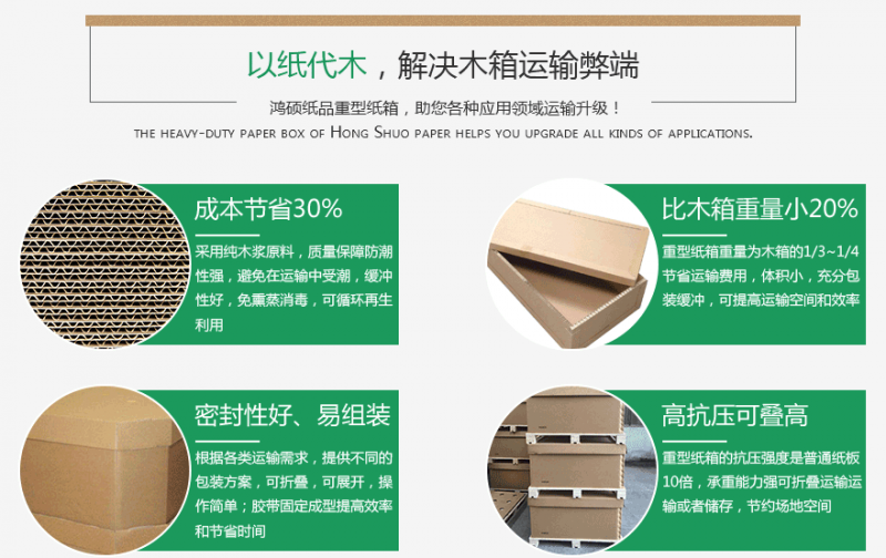 五、重型八角紙箱成本低。由于蜂窩紙板比瓦楞紙板用紙量少,蜂窩紙芯可用廉價的再生紙(草漿紙),或用麥桔、稻草作原料,資源十分豐富,從而使蜂窩紙箱的成本僅為相同厚度瓦楞紙箱成本的2/3、木質板箱成本的1/3。重型紙箱包裝廠