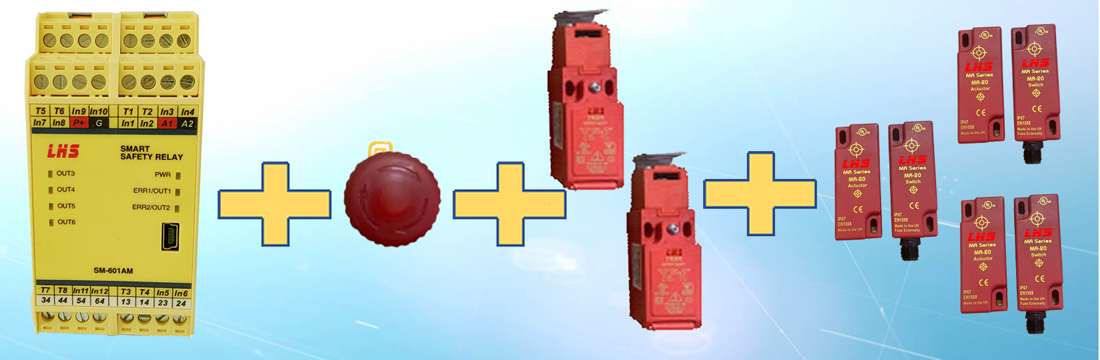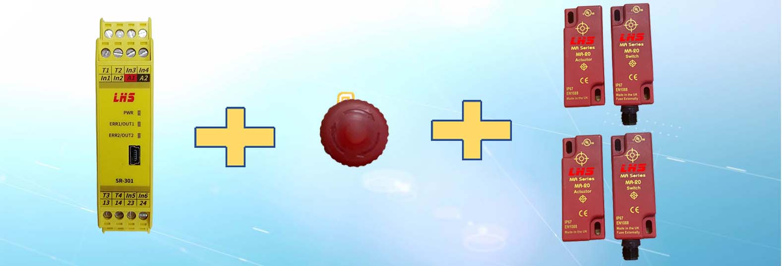 | 適合多個門的包裝設備 3個磁感應+ 2個連鎖 + 急停+ 安全控制器 不串聯最多6個產品。 |