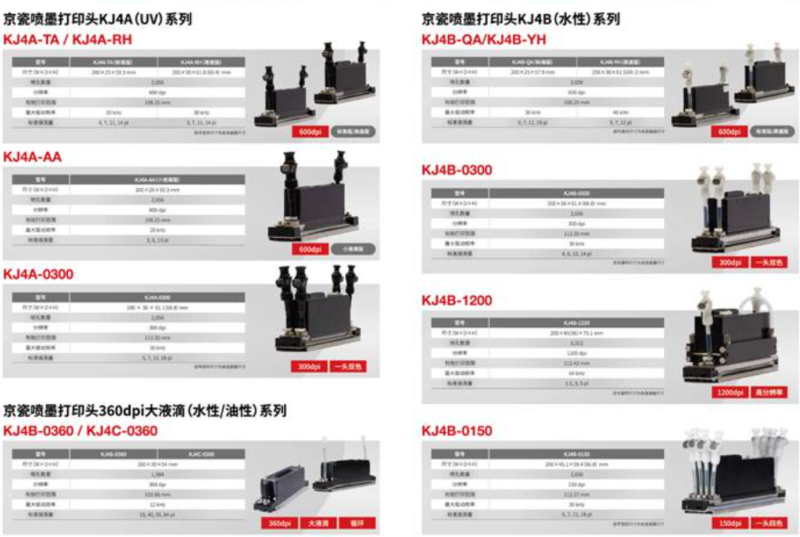 京瓷噴頭主要有三個型號,分別為KJ4A/KJ4B/KJ4C,KJ4A適用于UV墨水的打印,KJ4B適用于水性墨水的打印,KJ4C適用于油性墨水的打印,還有標準版和高速版,