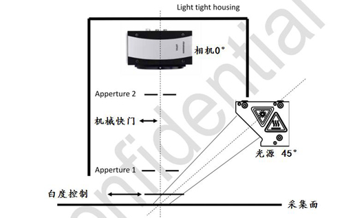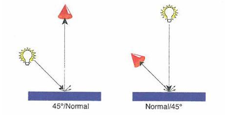 若三要素已知,在國際照明組織的顏色測量標準(顏色測量國際標準:ISO13655.要求光源跟相機的幾何位置如下:相機(觀測者)與豎直方向0°,光源(光照)與水平方向45°。)約定下,即可以精確測量出待測物體的顏色。