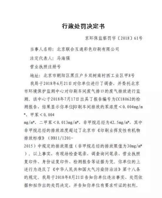 北京環境保護局于2018年10月18日發布了京環保監察罰字〔2018〕61號行政處罰決定書,該文件顯示,北京聯合互通彩色印刷有限公司因廢氣排放超標,被處十萬元罰款,并責令其立即改正違法行為。