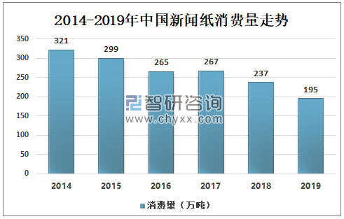 受下游市場消極影響,新聞紙消費量逐年下滑,但下滑速度較產量下滑速度慢,整體消費量較產量更高,新聞紙國內市場出現輕微的供不應求狀態。2018年,多家報刊停刊停辦,再加上由于報業廣告經營的下滑以及發行量下降等因素,報紙出現減張、縮版、減量的情況,致使報業新聞紙采購量繼續下降。2019年我國新聞紙消費量達到195萬噸,較2018年下滑17.72%,但較2019年產量多出30%。