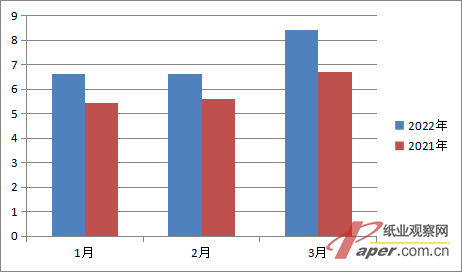 2022年1月份,銅版紙出口量6.62萬噸,同比增長21.55%,出口額6828萬美元,同比增長40.35%;2月,出口量6.62萬噸,同比增長18.43%,出口額6926萬美元,同比增長39.16%;3月,出口量8.42萬噸,同比增長25.34%,出口額8596萬美元,同比增長36.21%。
