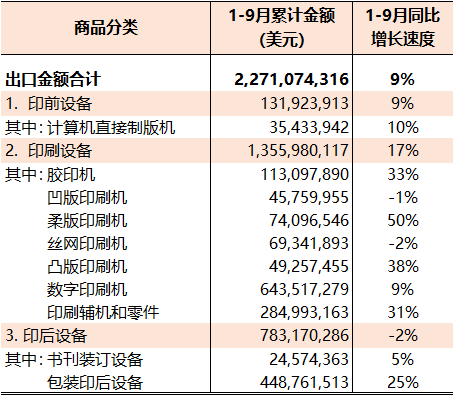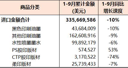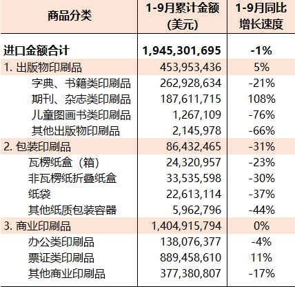 1-9月份國內印刷品、印刷裝備、印刷器材相關商品進出口同比增長8%,較1-8月同比增速(10%)下降2個百分點,增長幅度有所收窄。