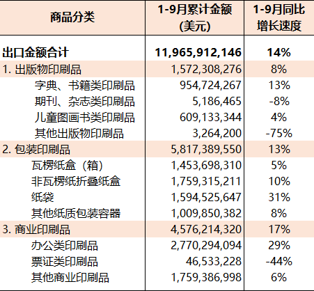 同期,相關印刷品主要出口品種:字典書籍類印刷品9.55億美元(同比增長13%)、兒童圖畫書類印刷品6.09億美元(同比增長4%)、瓦楞紙盒(箱)14.54億美元(同比增長5%)、非瓦楞紙折疊紙盒17.59億美元(同比增長10%)、紙袋15.95億美元(同比增長31%)、其他紙質包裝容器10.10億美元(同比增長8%)、辦公類印刷品27.70億美元(同比增長29%)、其他商業印刷品17.59億美元(同比增長6%)。