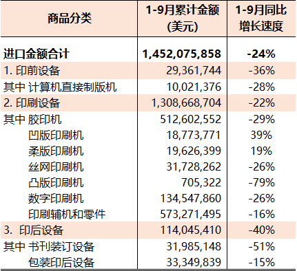 表4 2022年1-9月國內印刷裝備進口統計