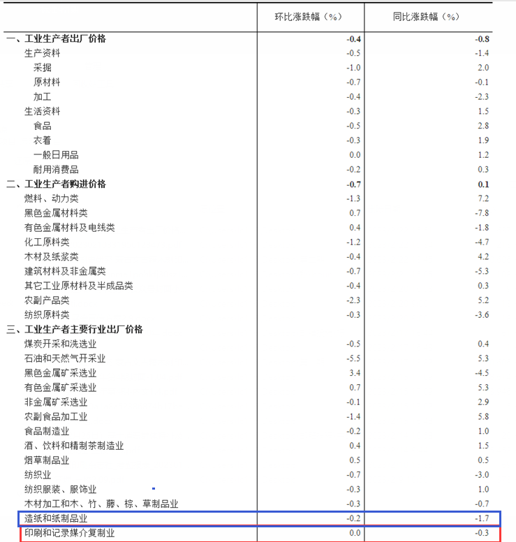 其中,造紙和紙制品業工業生產者出廠價格同比下降1.7%,印刷和記錄媒介復制業工業生產者出廠價格同比下降0.3%。