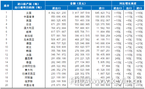 出口金額10.19億美元(同比下降14%)。居出口金額前五位的國家(地區)有,美國(4.63億美元)、中國香港(1.57億美元)、英國(6906.07萬美元)、澳大利亞(3168.49萬美元)、荷蘭(2331.46萬美元);